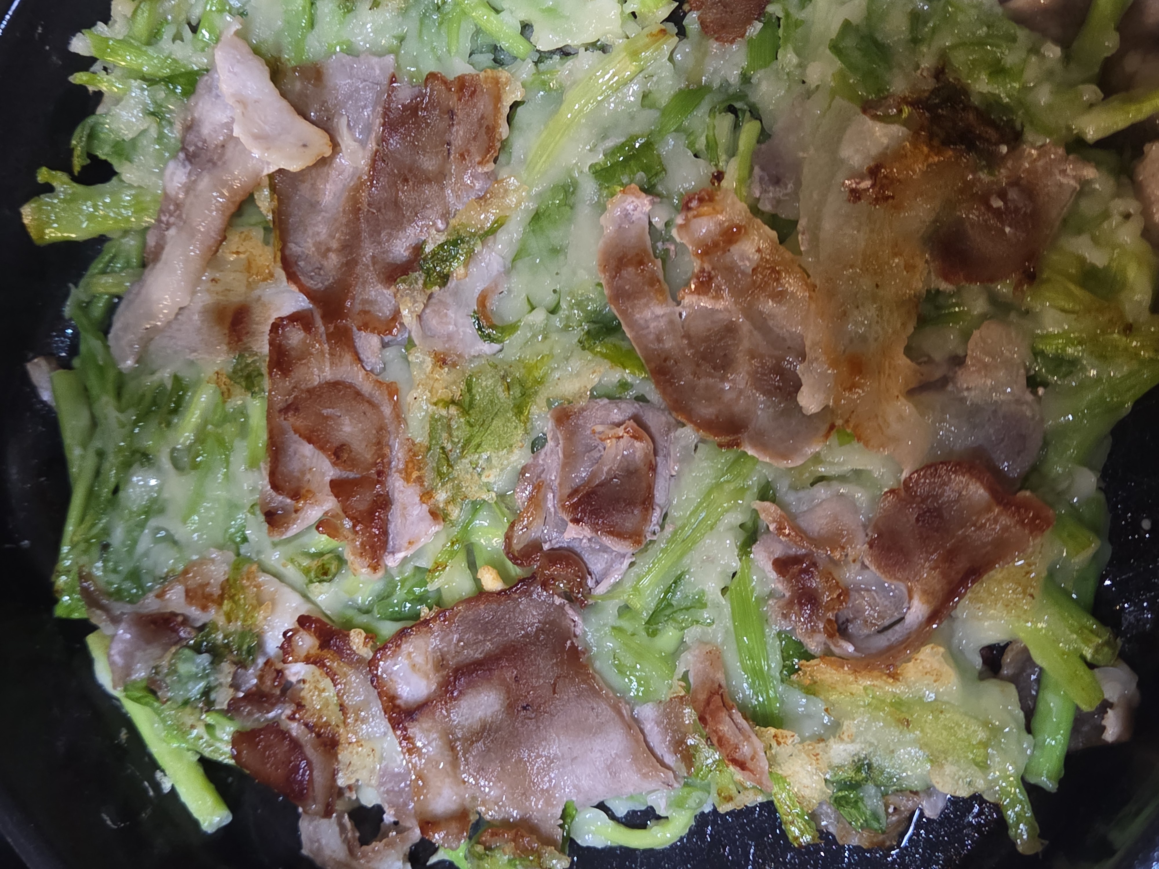 프라이팬을 달궈 대패삼겹살을 살짝 노릇할 정도로 굽습니다. 그 위에 식 반죽을 얇게 펴서 올립니다. (대패 기름을 이용하나 부족하면 식용유 추가! )