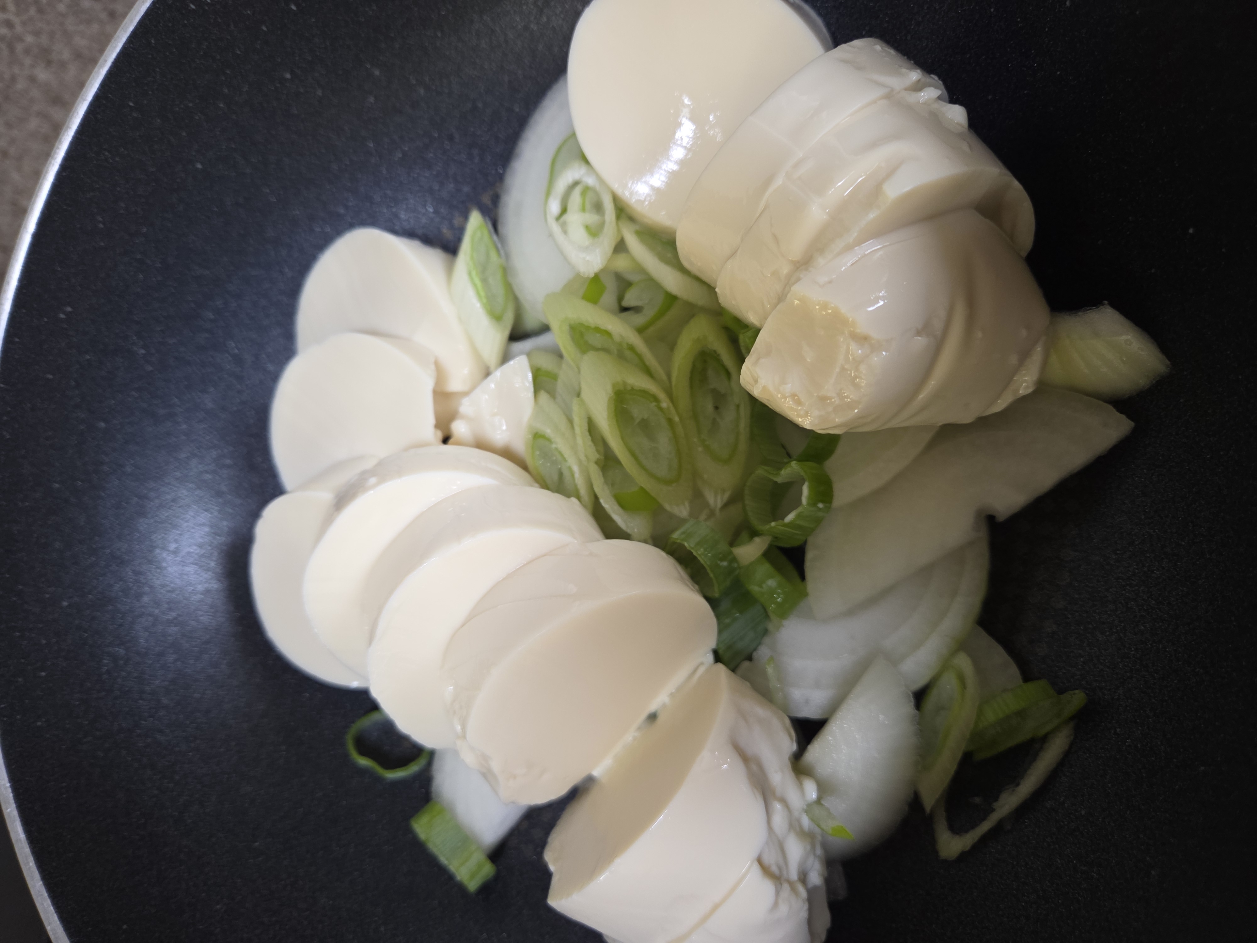 볶아낸 채소 위에 순두부를 올리고, 준비한 양념장을 골고루 부어줍니다. 순두부가 쉽게 부서지니 젓가락보다는 숟가락으로 살살 다뤄주세요.