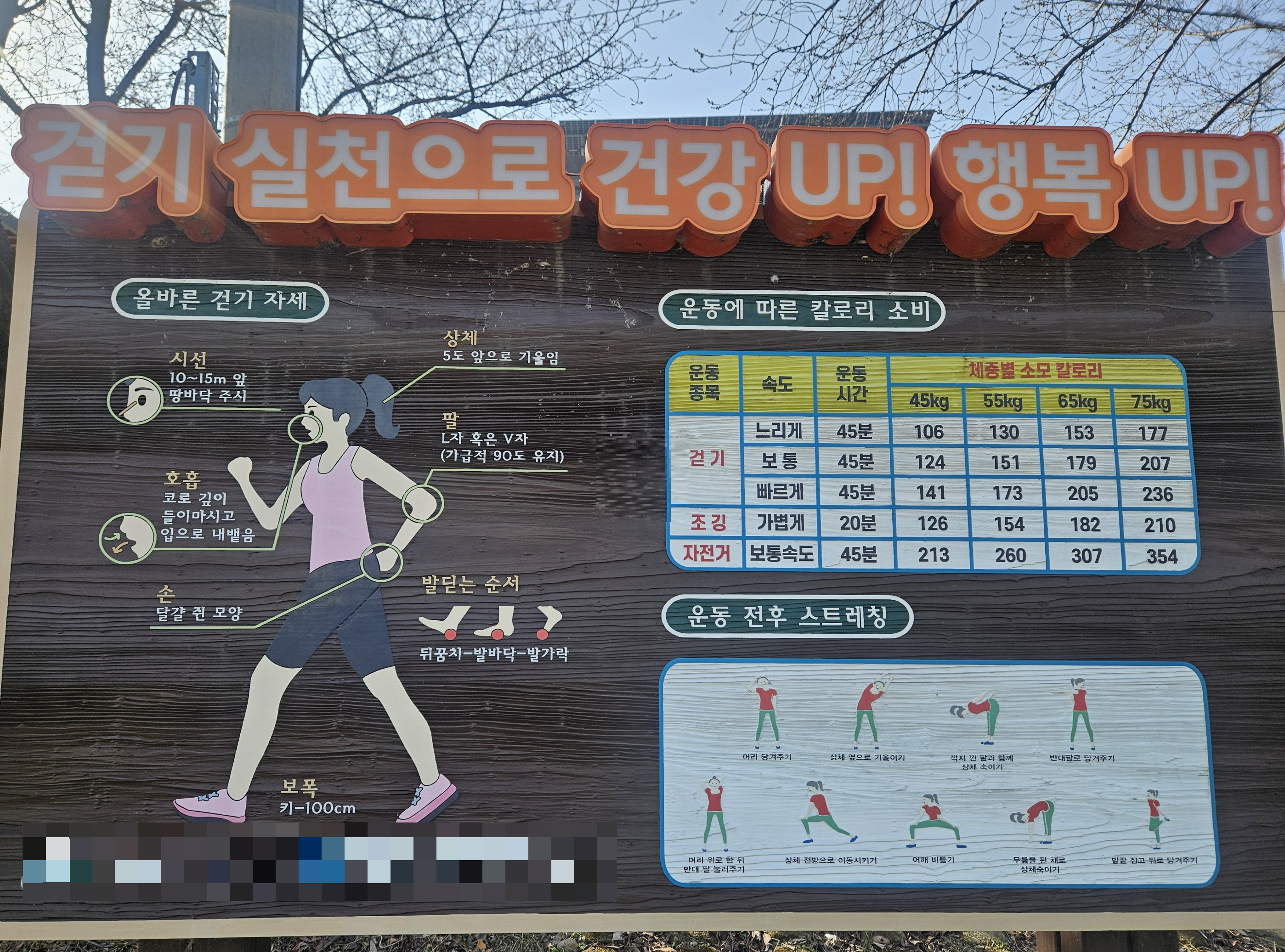 - 무리하게 걸으면 무릎이나 발목에 부담이 갈 수 있으므로 자신의 체력에 맞게 운동해야 합니다.