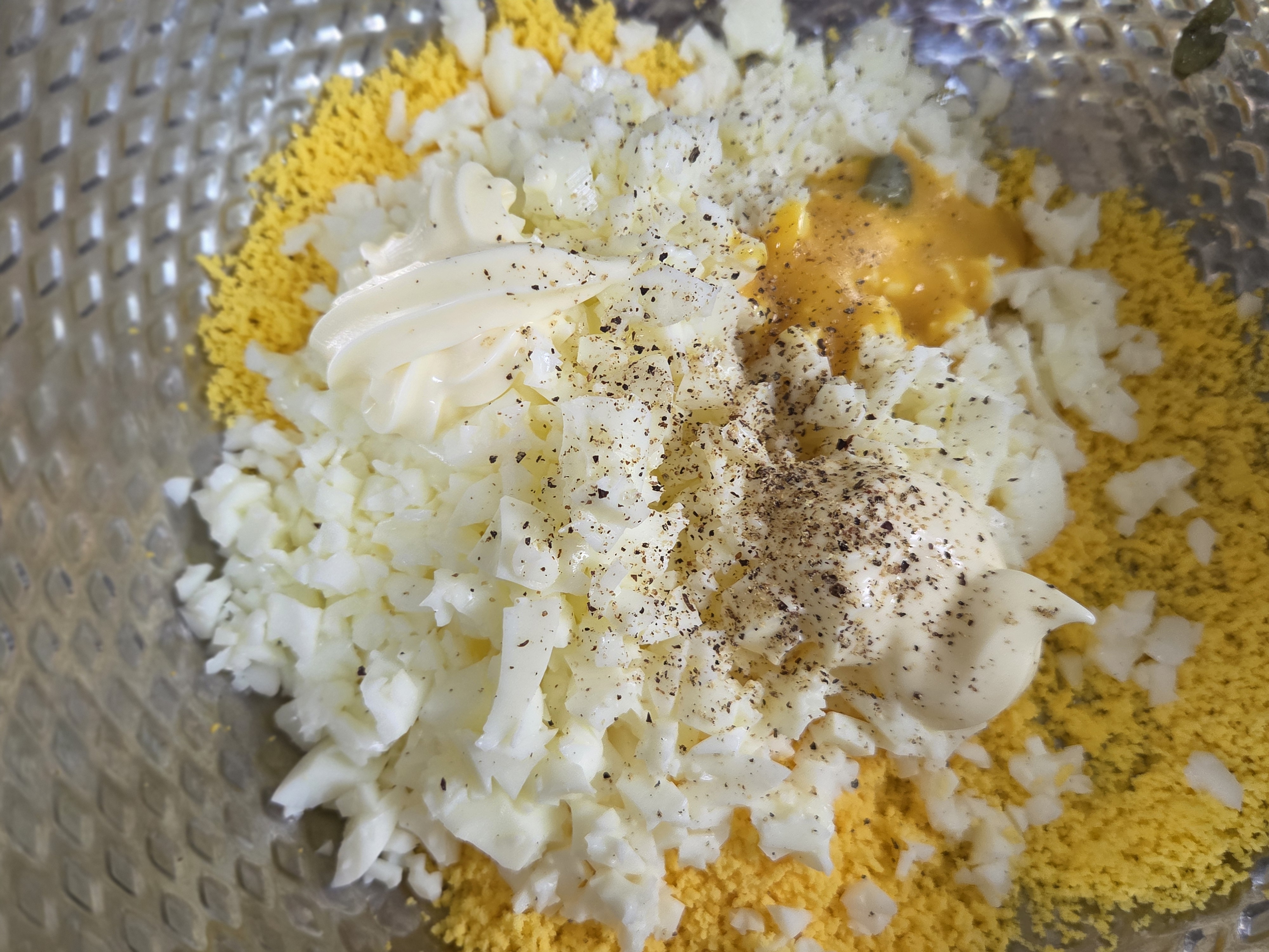 - 달걀에 마요네즈 2큰술, 소금과 후추 약간을 넣고 잘 섞어주세요.