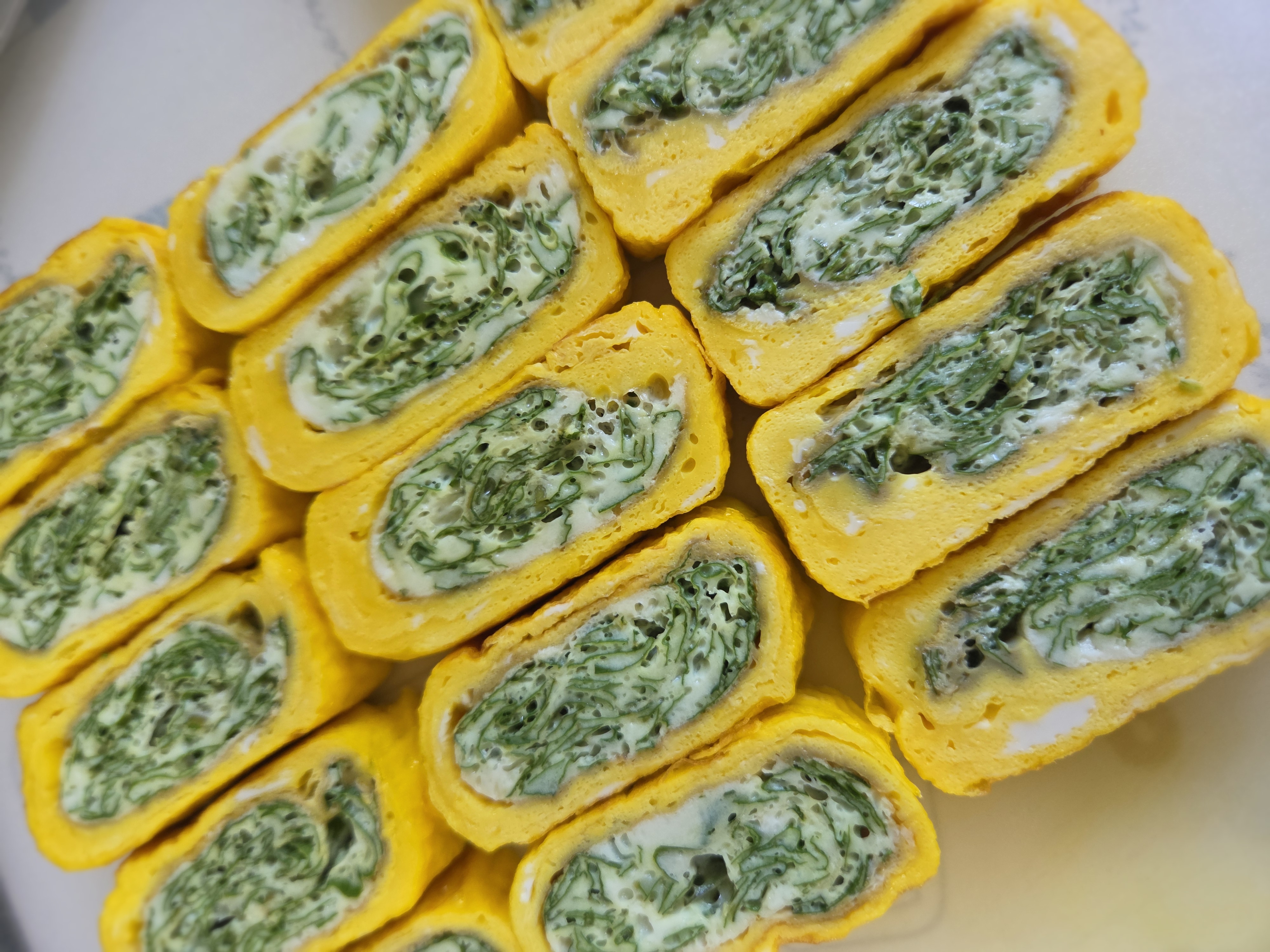 - 계란말이를 식힌 뒤 1.5~2cm 간격으로 썰어 접시에 담습니다.