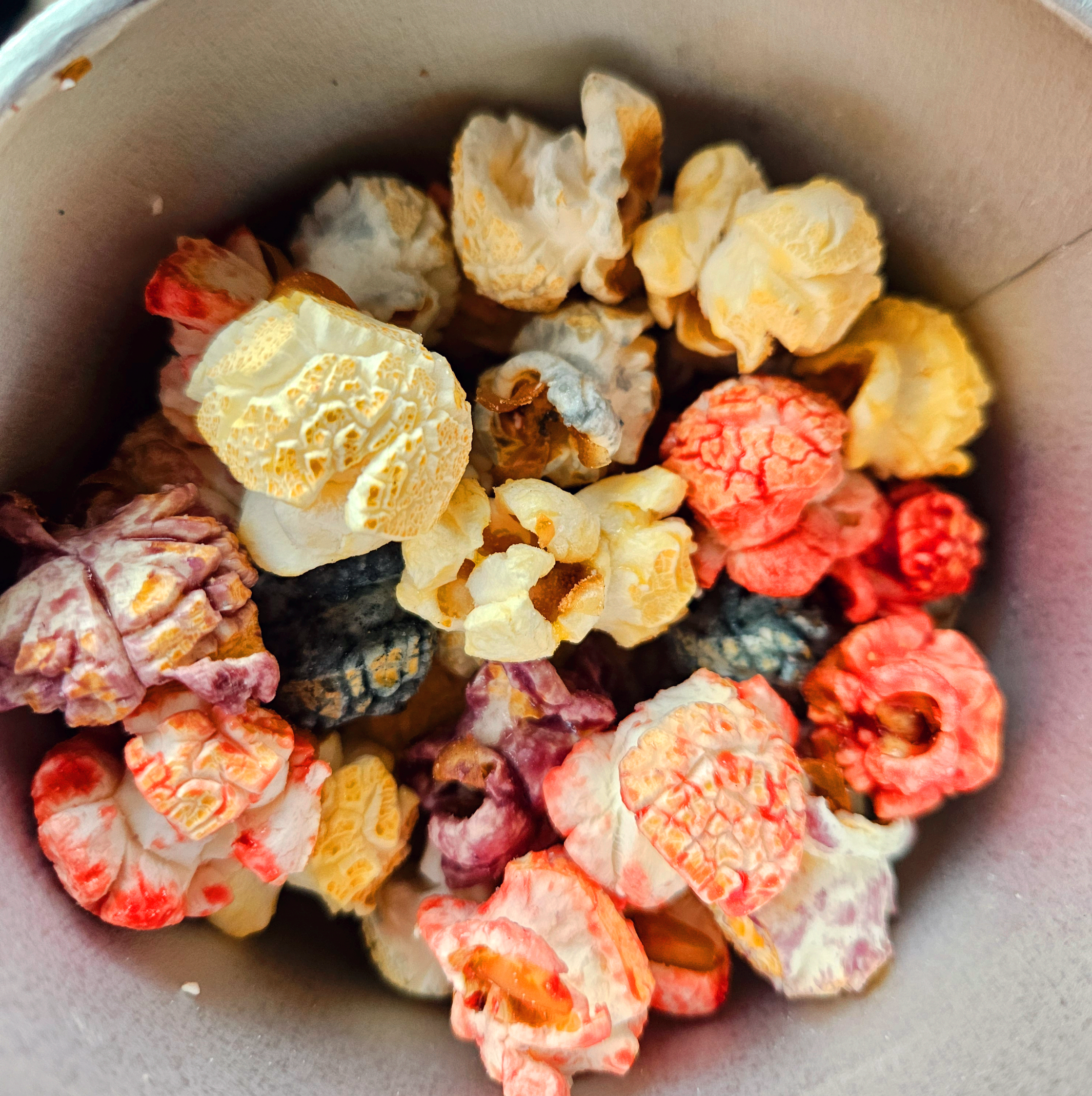 네 가지 색의 팝콘은 색만 다를 뿐 맛이 다르지는 않아요. 다른 맛일 거라고 기대했는데 색소로 색만 낸 것이었어요.