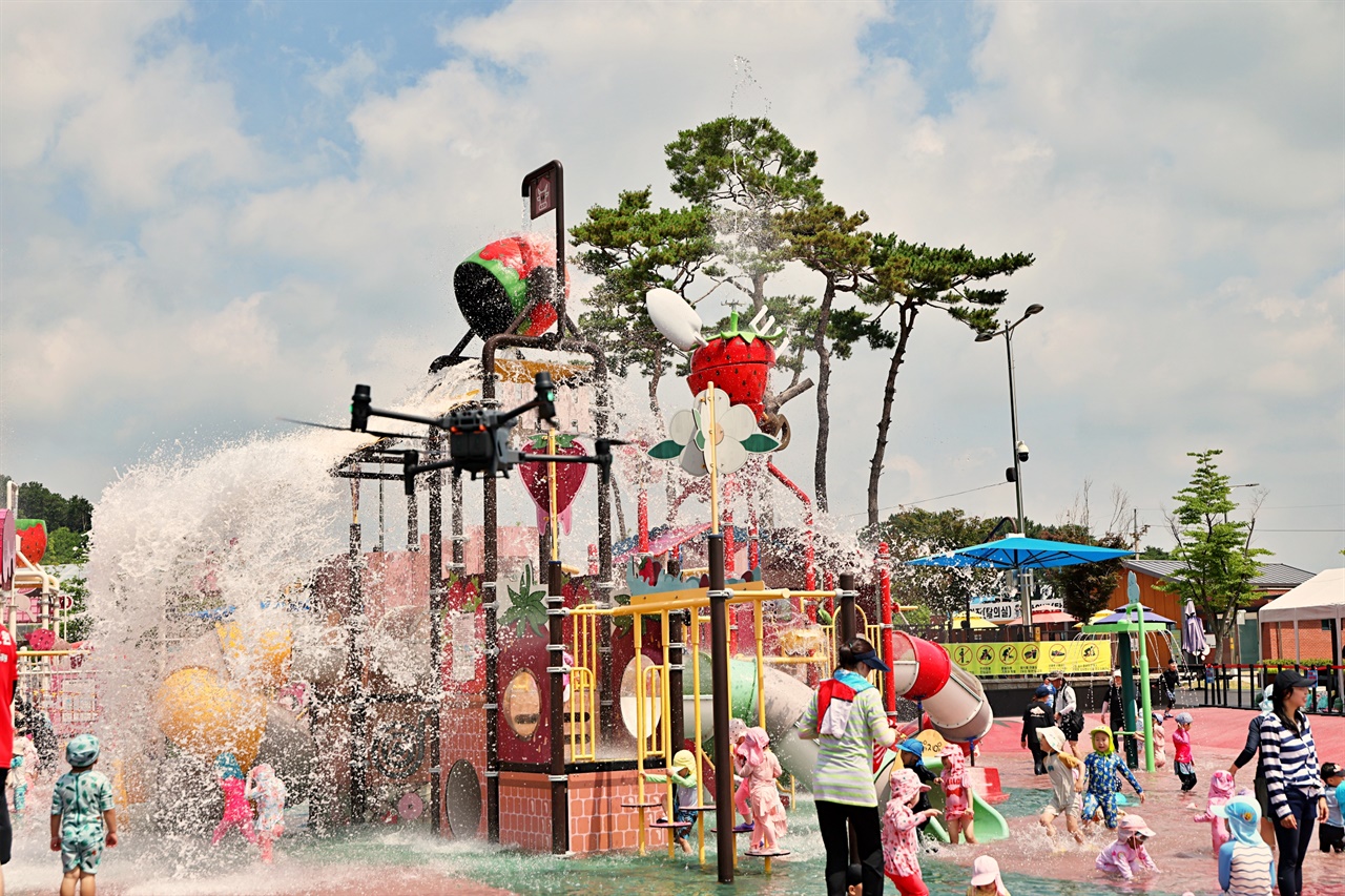 충남 논산시에 위치한 딸기향 농촌테마공원의 무료 물놀이터가 이번 여름에도 큰 인기를 끌고 있습니다.