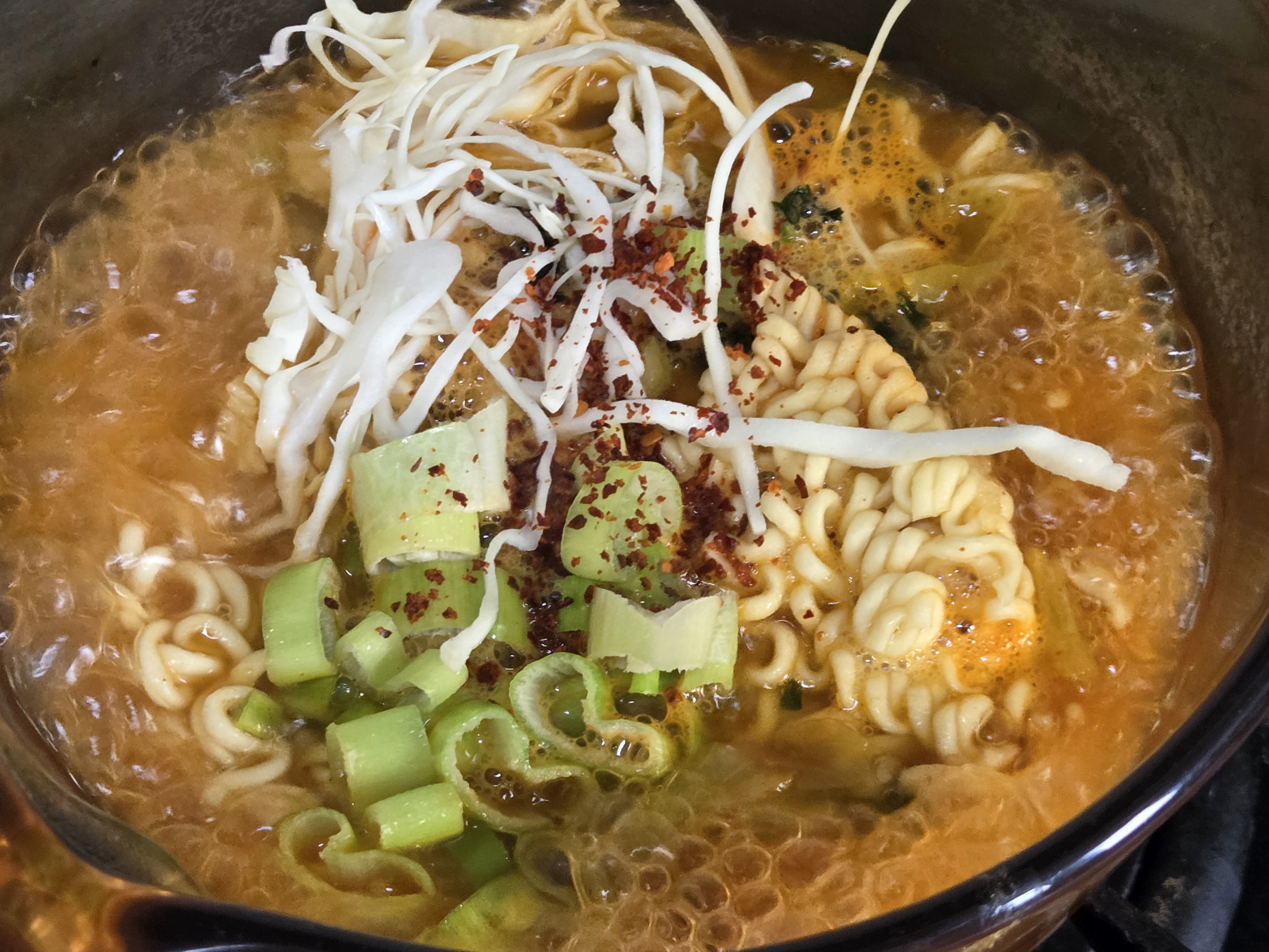 양배추, 대파, 고춧가루 넣고 끓여서 면 건져낸 후 국물에 계란 풀어 끓이면 끝!