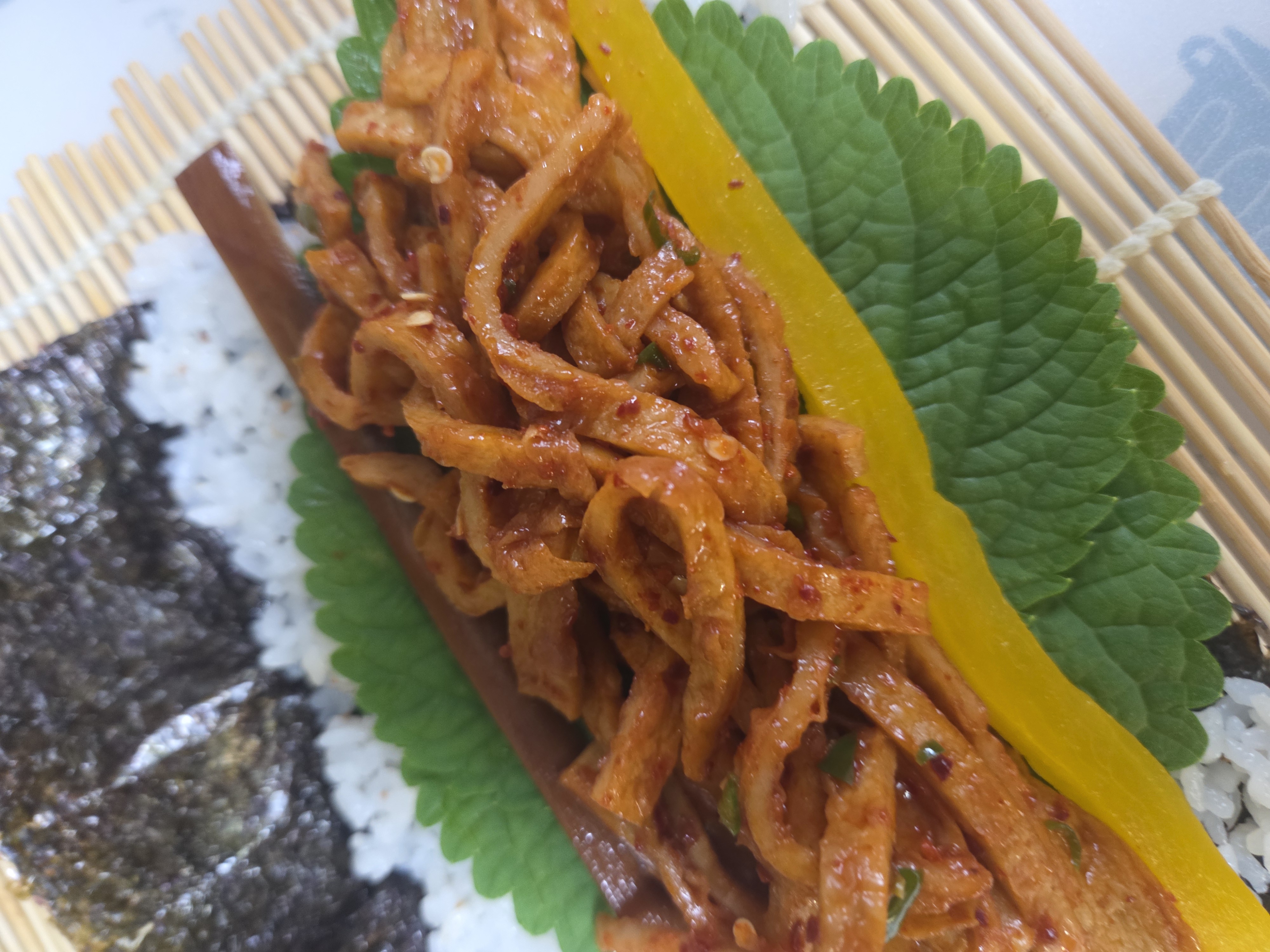 - 밥 위에 깻잎, 단무지, 우엉을 놓습니다.