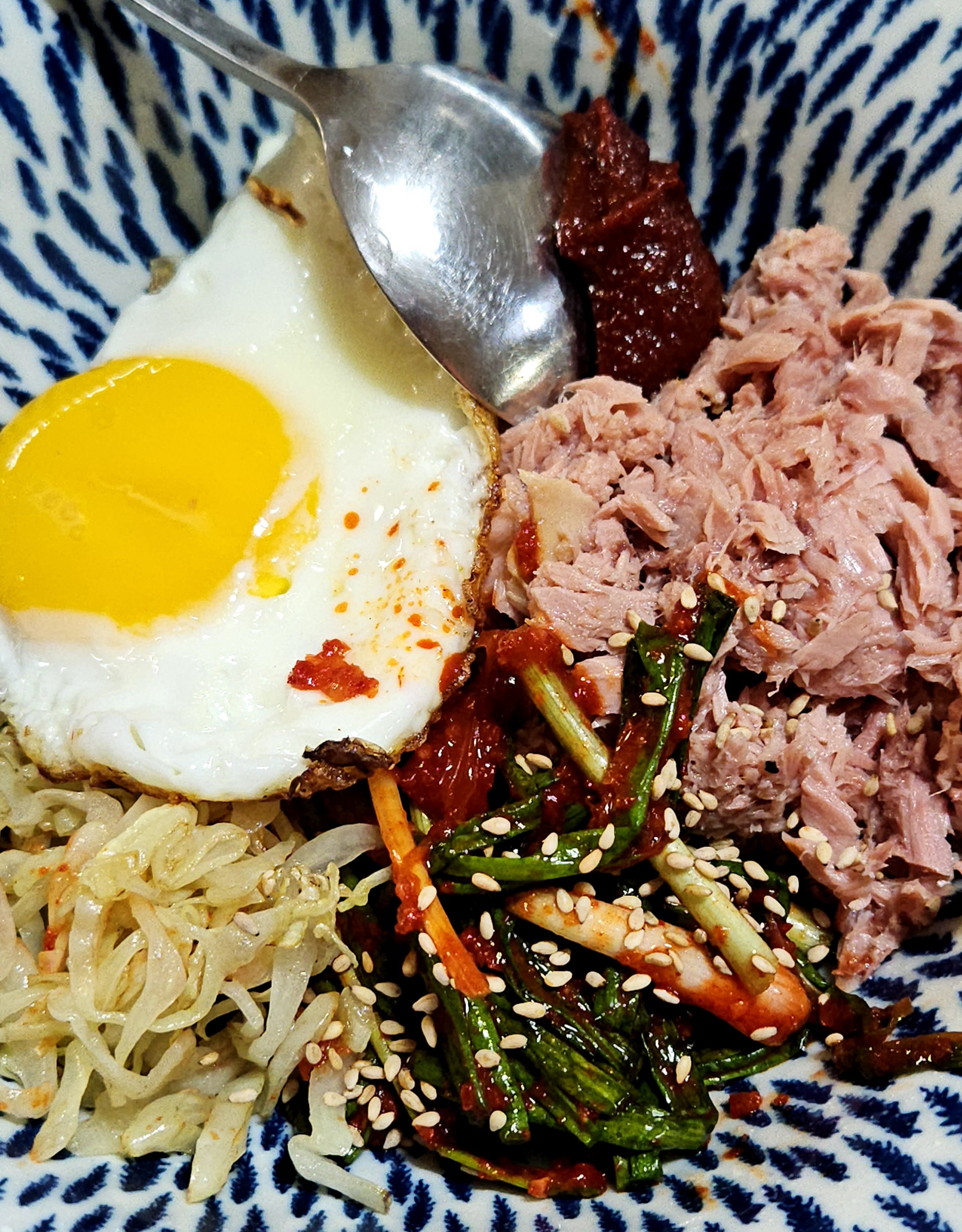 저는 이렇게 싹싹 비벼서 배추김치를 얹어서 먹었어요.