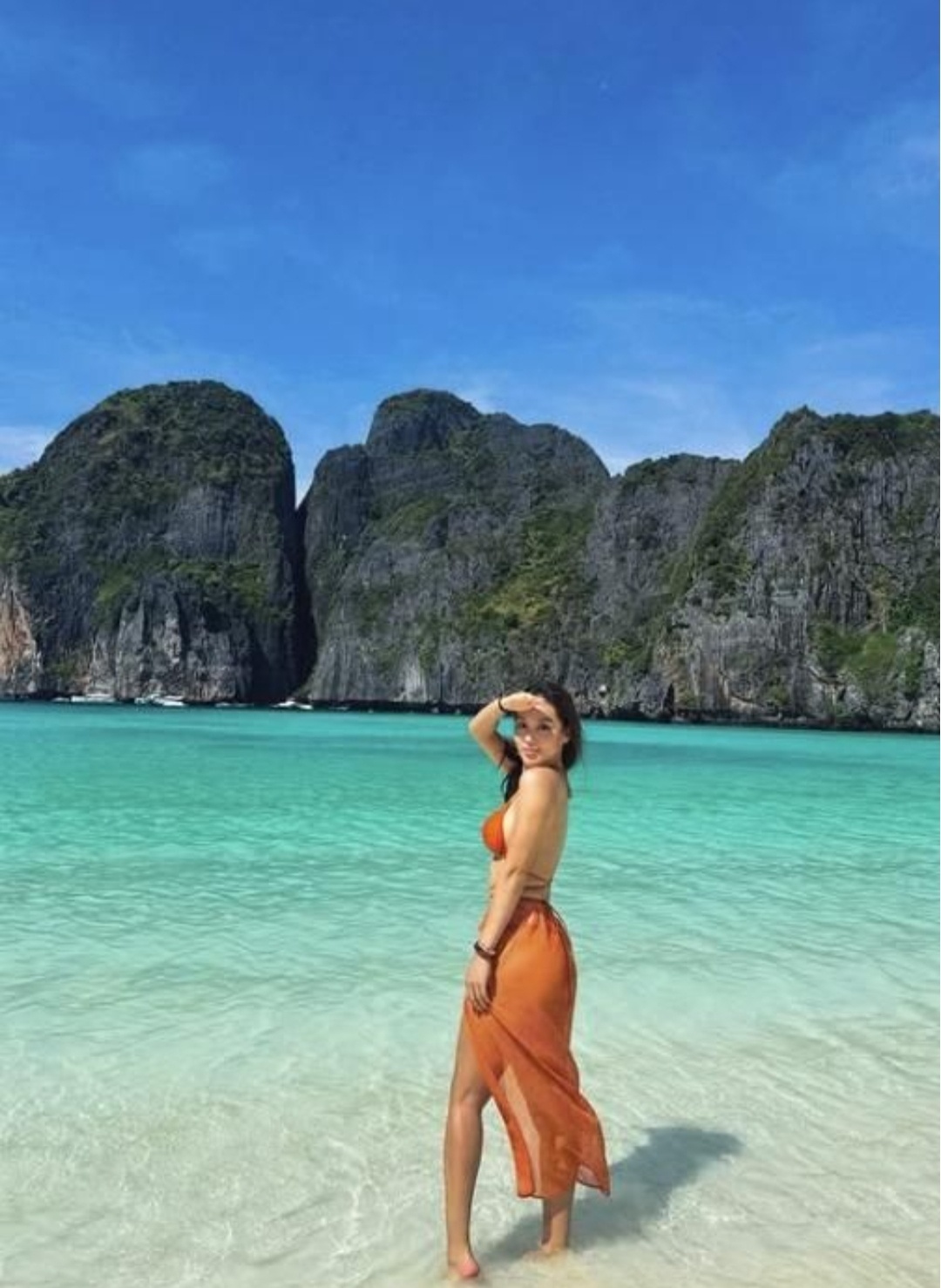 주황색 컬러의 비키니를 입고 당당한 포즈를 하고 있다.
