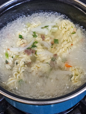 2. 재료들을 채 썰어 라면과 함께 넣어 끓인 후 국물을 버리고 찬물에 잘 씻어준다!