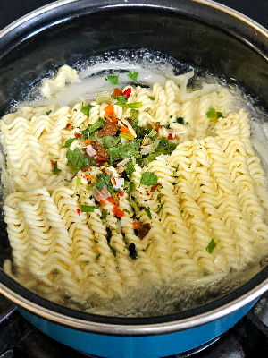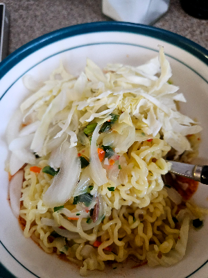저는 야채를 면 끓일 때도 넣고, 식감을 위해 생야채도 함께 넣었어요.