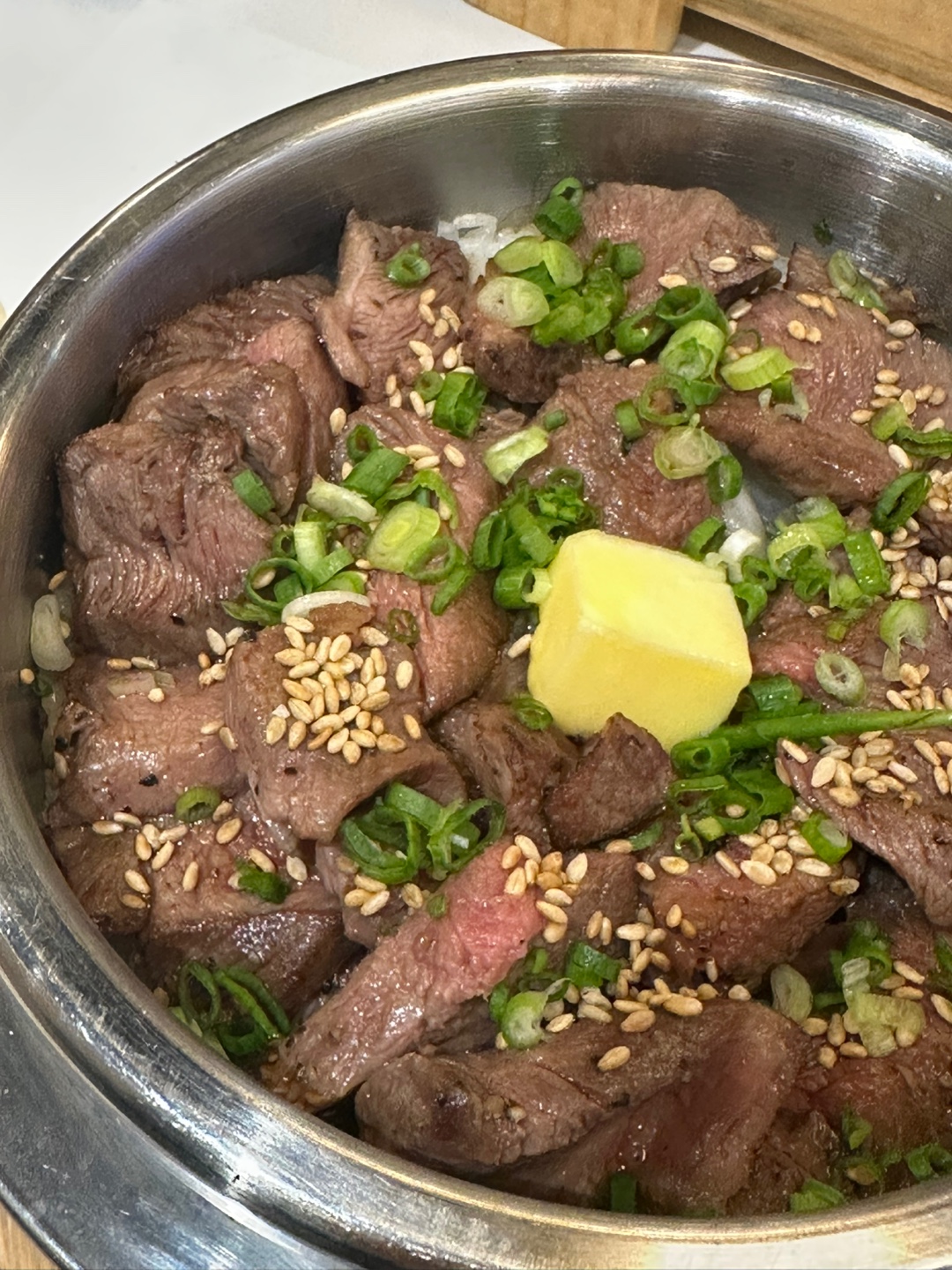 - 스테이크를 얇게 썰어 밥 위에 얹고