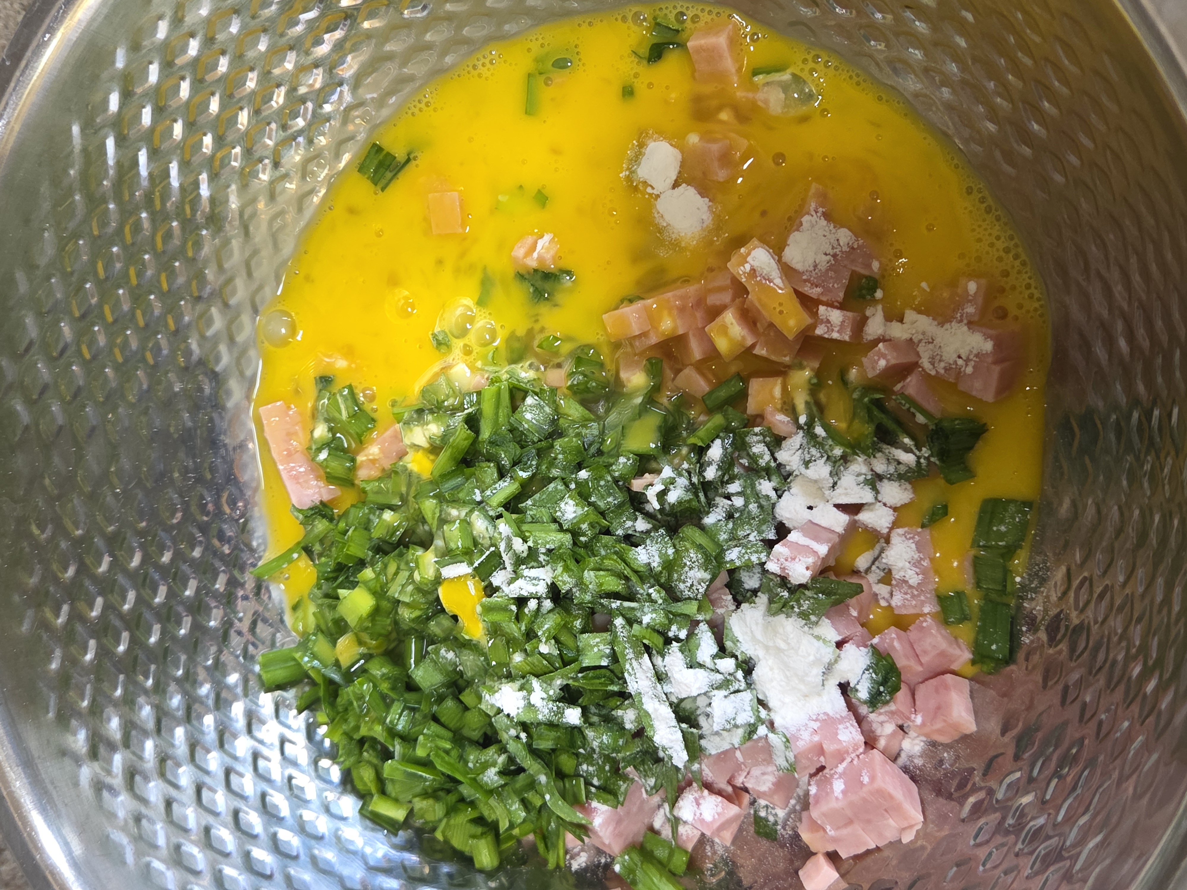 - 큰 볼에 계란을 풀어주고, 썰어둔 스팸, 부추, 양파를 넣습니다.