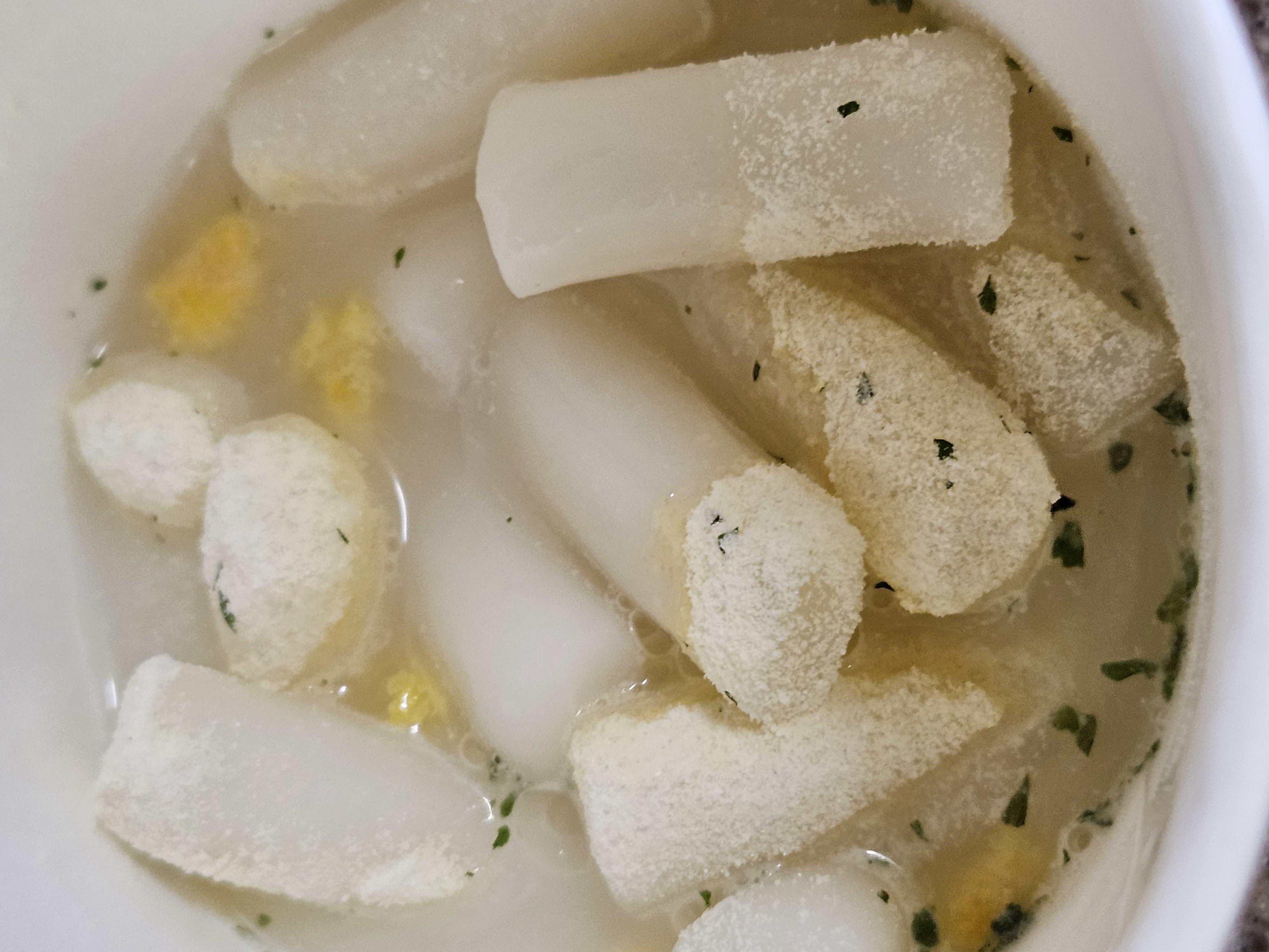 뜯어보니 분말스프와, 쌀떡이 들어있었어요.