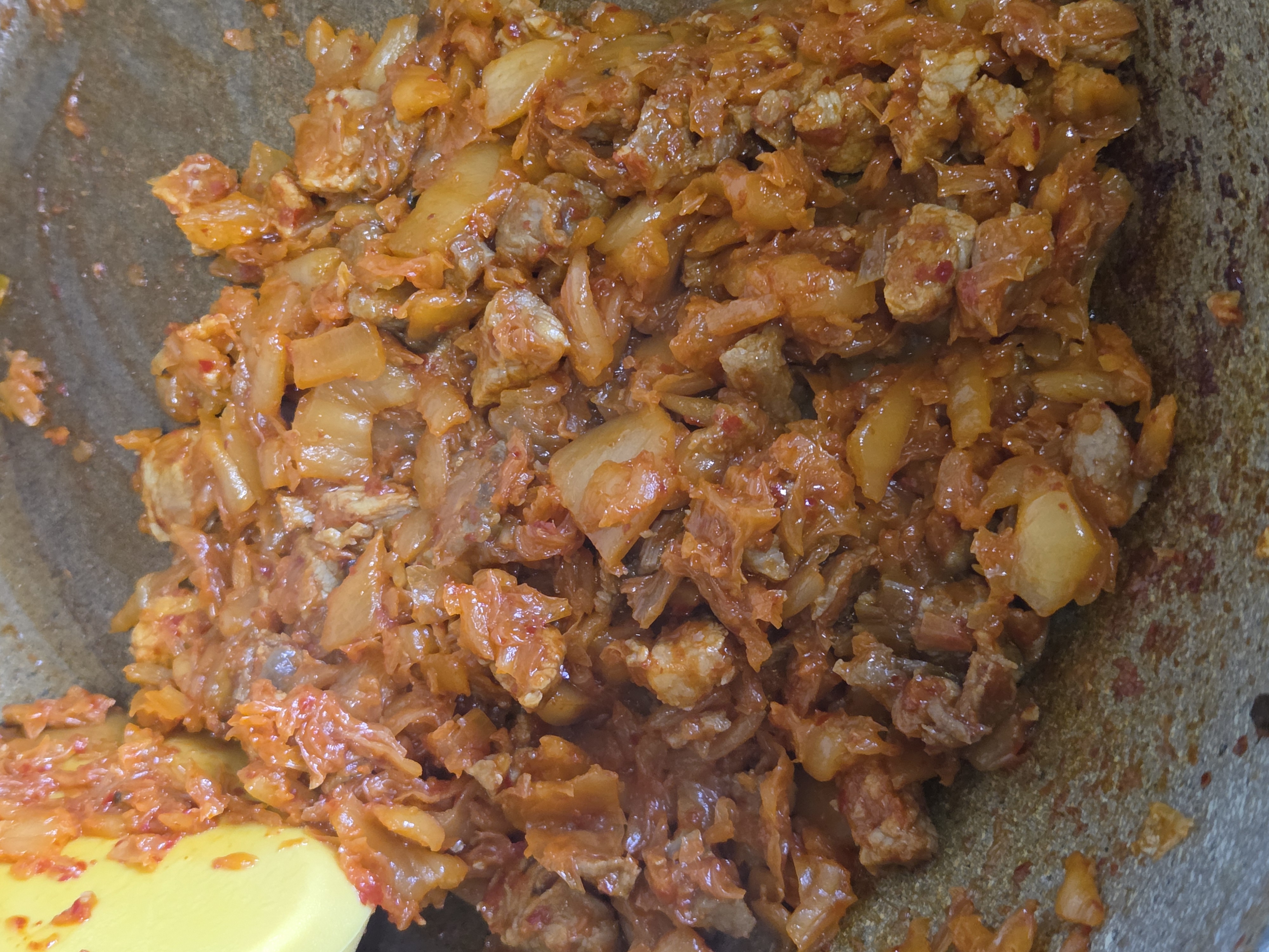 잘 익은 고기 위에 신김치 ¼포기를 넣고, 가위로 작게 잘라가며 중불에서 약 20분간 볶아 주세요. 이 과정에서 김치의 수분이 증발하면서 맛이 진해집니다.