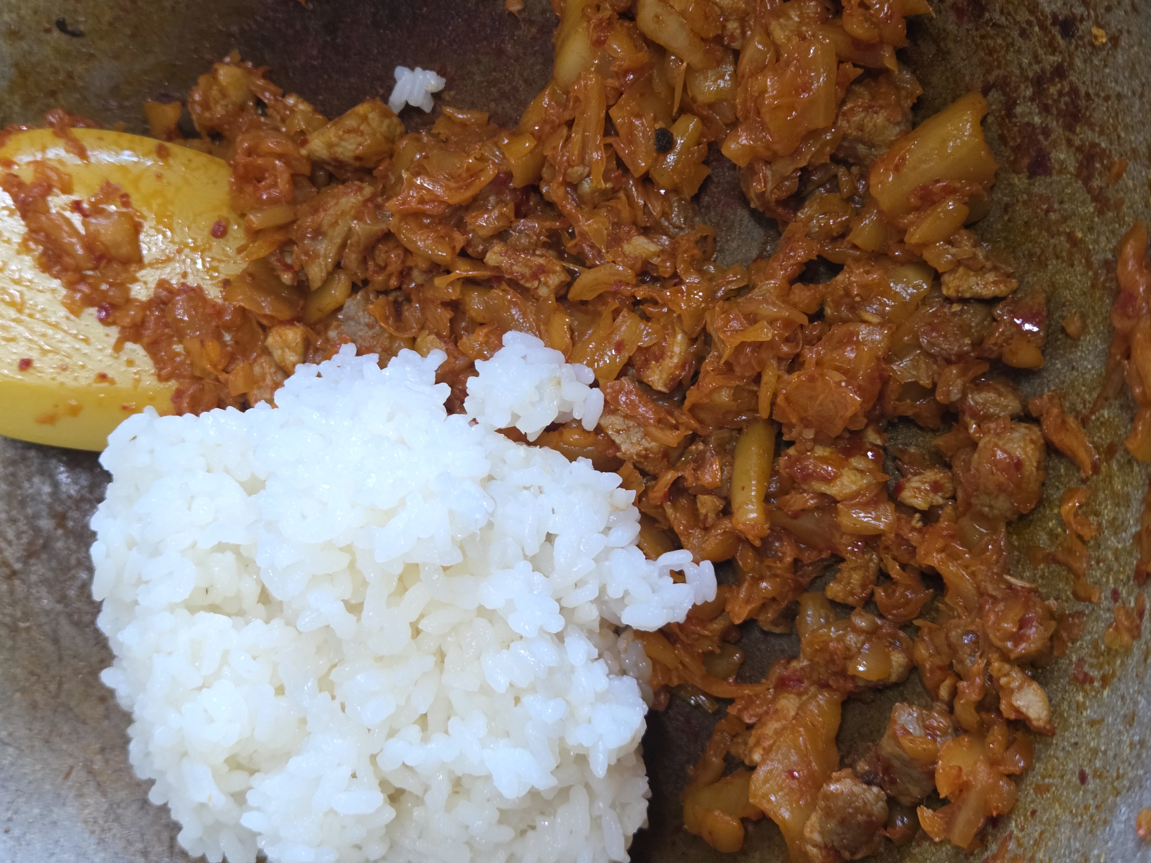 김치와 삼겹살이 잘 어우러지면 밥 2공기를 넣고, 계속 가위질하면서 잘 섞어 볶아줍니다. 마지막에는 밑면을 살짝 눌러 노릇한 식감을 살리는 것이 핵심입니다.