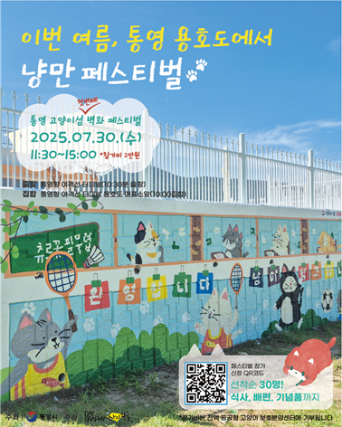 통영시 용호도(고양이섬)에서 열리는 제1회 통영 고양이섬 벽화 페스티벌이 2025년 7월 30일(수) 오전 11시 30분부터 오후 3시까지 개최된다.