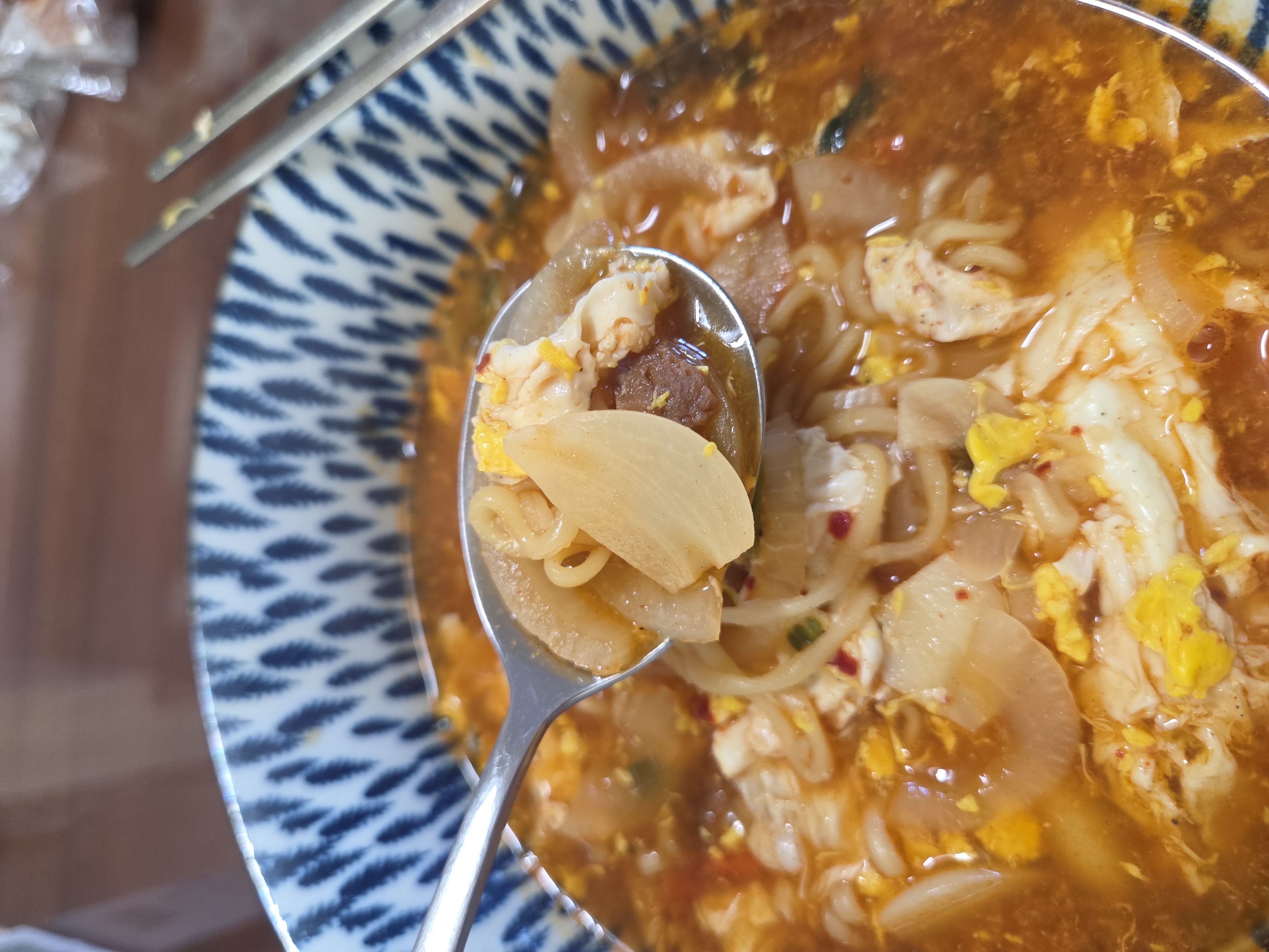 - 밥 말아먹기 : 양파와 마늘, 계란이 들어간 국물은 밥과도 정말 잘 어울립니다. 라면을 다 드신 후 밥 한 숟갈 넣어보세요.