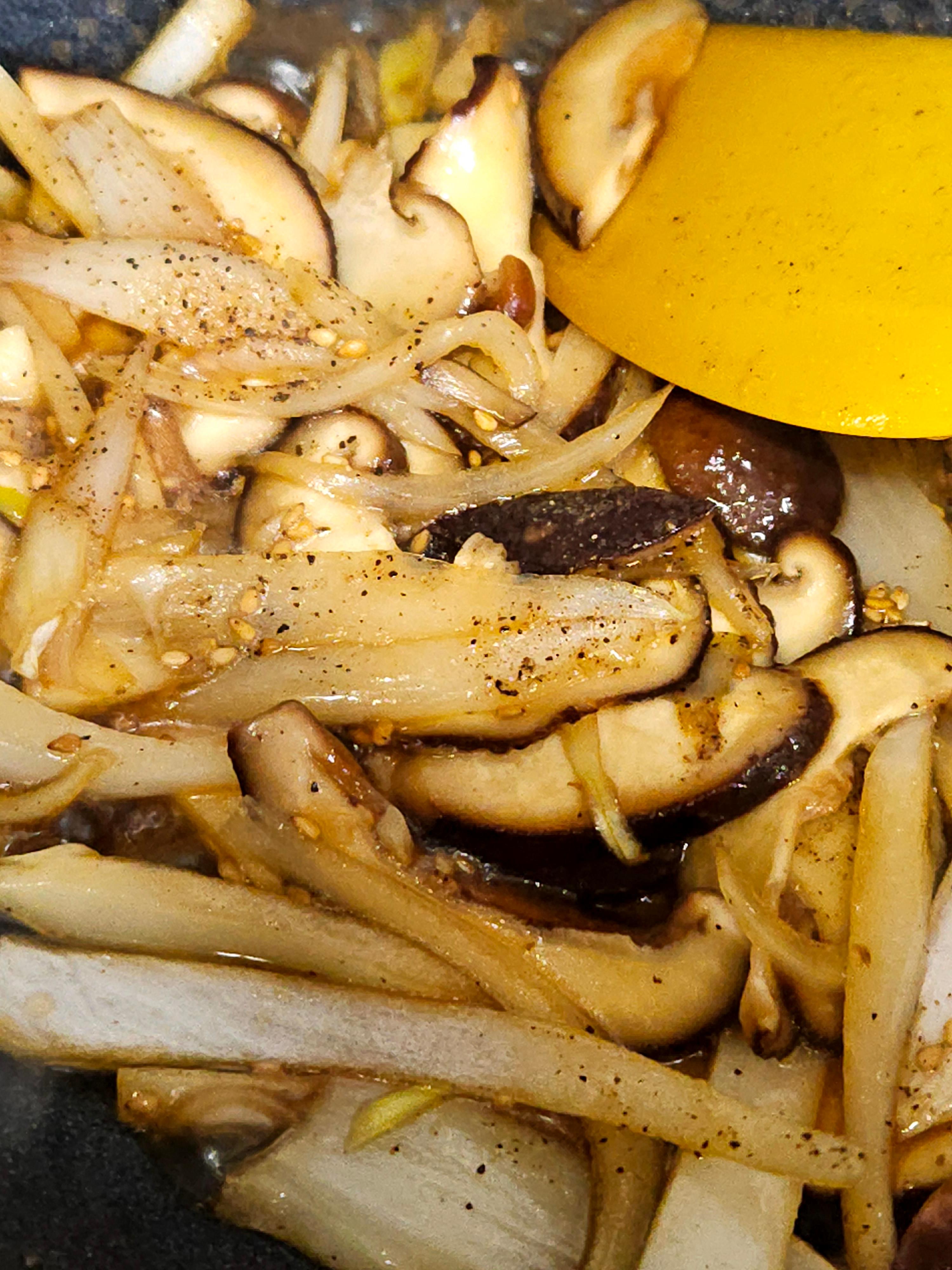 2. 양파와 편으로 썬 표고버섯을 넣고 볶습니다.