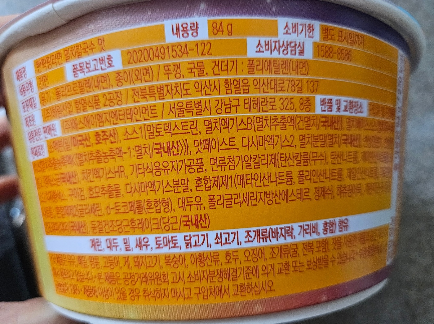 | 영양정보 총 내용량84g/ 270kcal 나트륨 1,200mg 60% 탄수화물 58g 18% 당류 3g 3% 지방 1.1g 2% 트랜스지방 0g 포화지방 0.3g 2% 콜레스테롤 5mg 2% 단백질 7g 13% 하츄핑 라면과는 조금 차이가 있어요. |