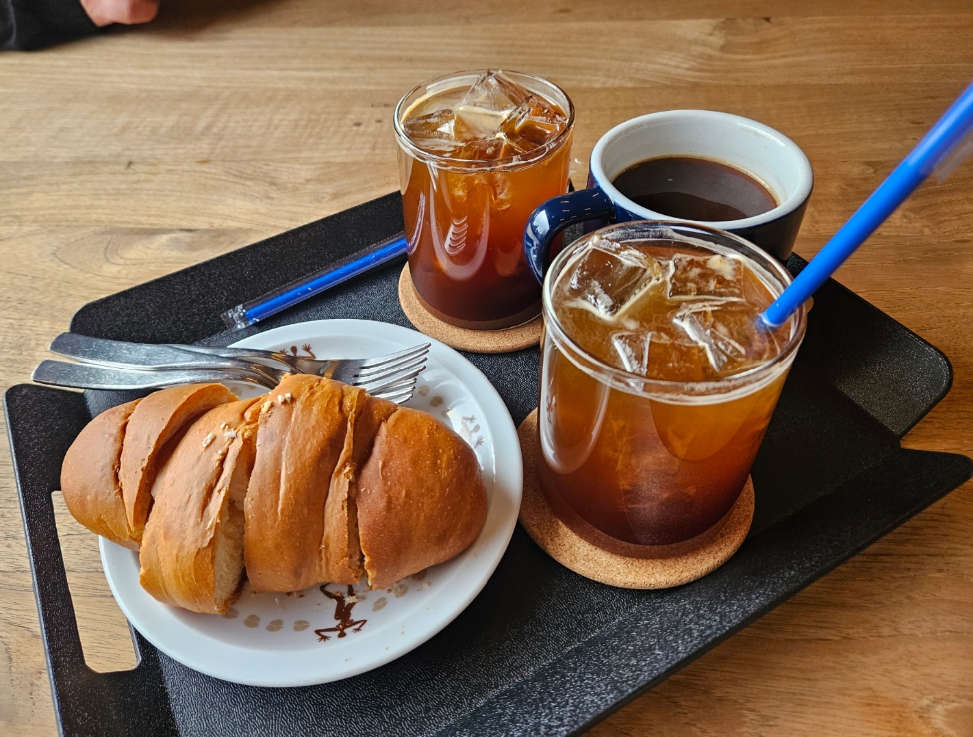 베이커리류는 소금빵과 몽블랑 두 가지만 있었어요. 소금빵 주문했더니 따뜻하게 데워서 내주셨답니다.
