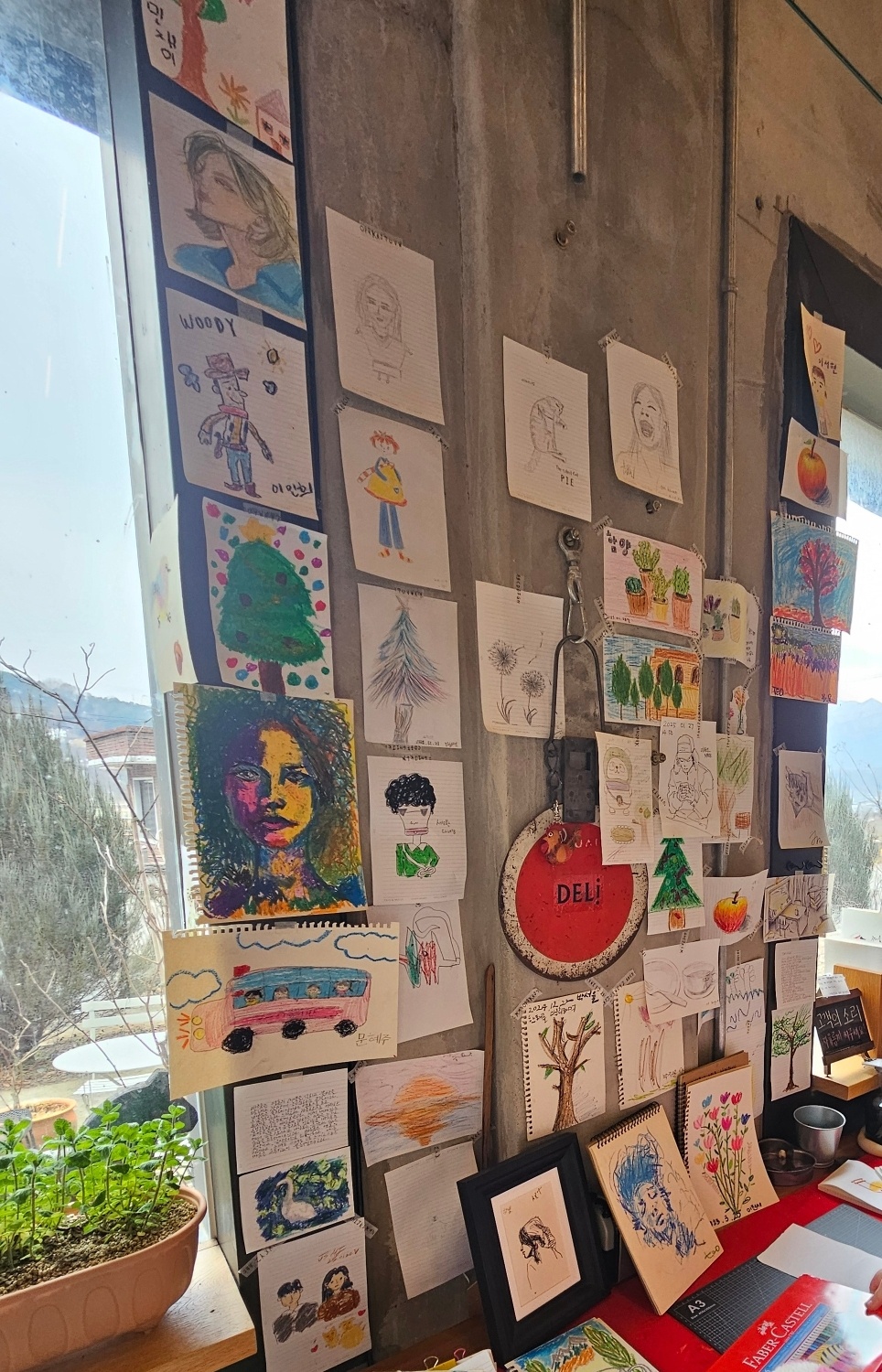 또 한 가지 좋은 점은 그림을 그릴 수 있는 공간이 있었어요. 종이와 색연필이 있어서 아이가 그림을 그리느라 카페에서 핸드폰 사용을 하~~ 나도 안 했어요. 어른들은 편하게 대화하며 커피를 마셨고요. 정말 만족스러운 점이었어요 ^^