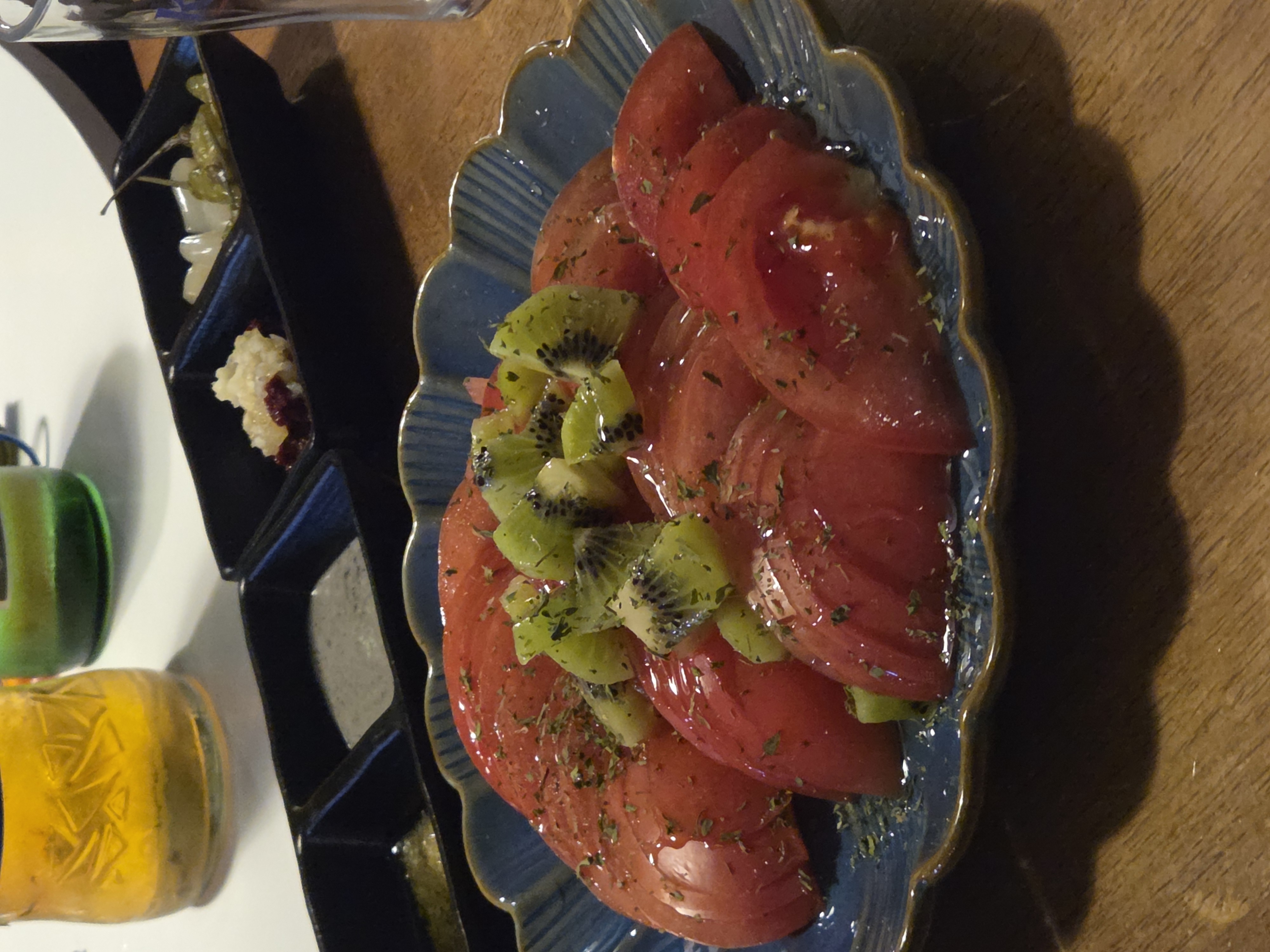 - 꿀토마토, 키위, 견과류, 발사믹 소스로 간단히 버무리면 완성