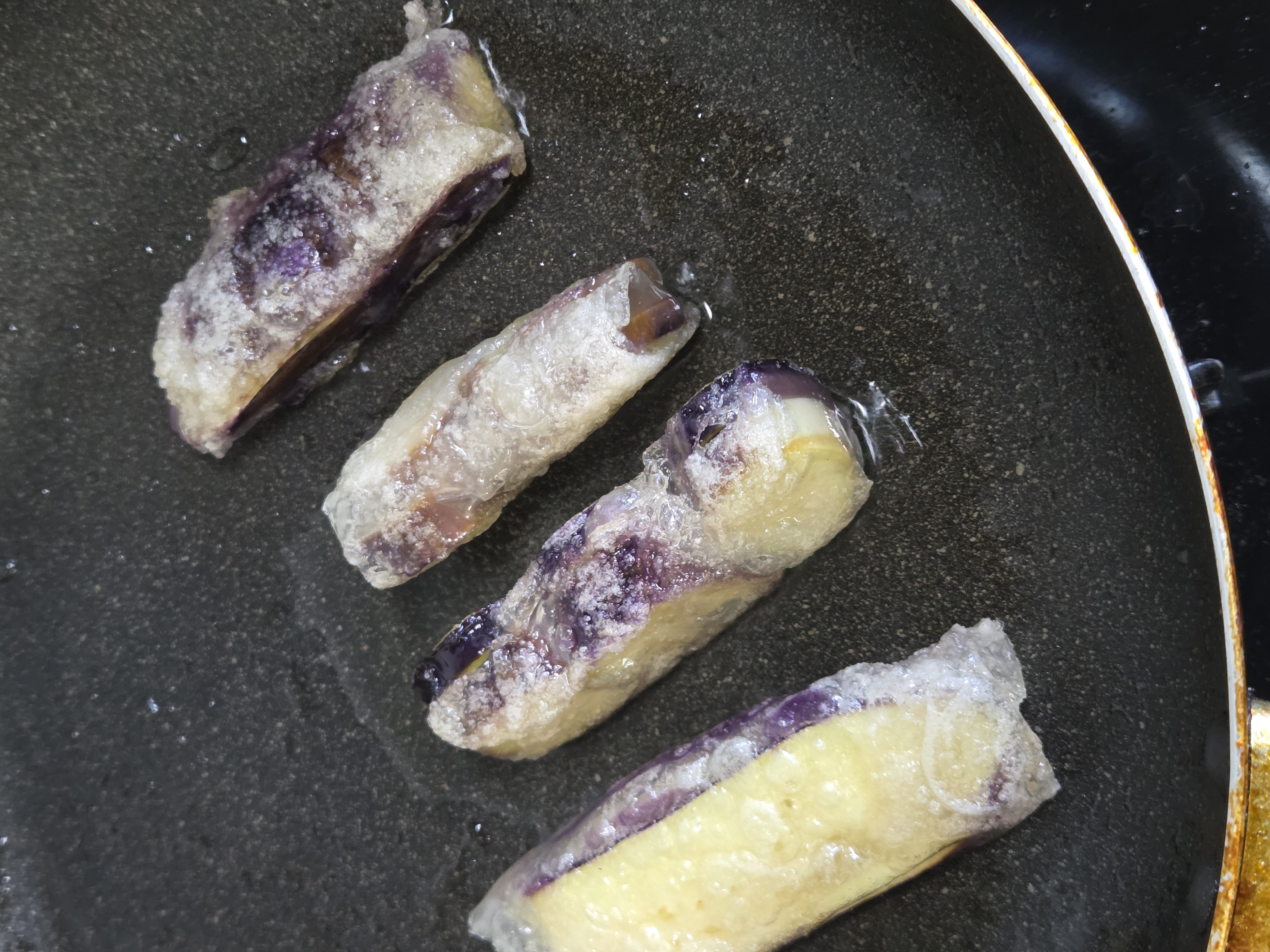 프라이팬에 기름을 넉넉히 두르고 중불에서 예열한 후, 라이스페이퍼에 감싼 가지를 넣고 앞뒤로 노릇하게 튀겨줍니다.