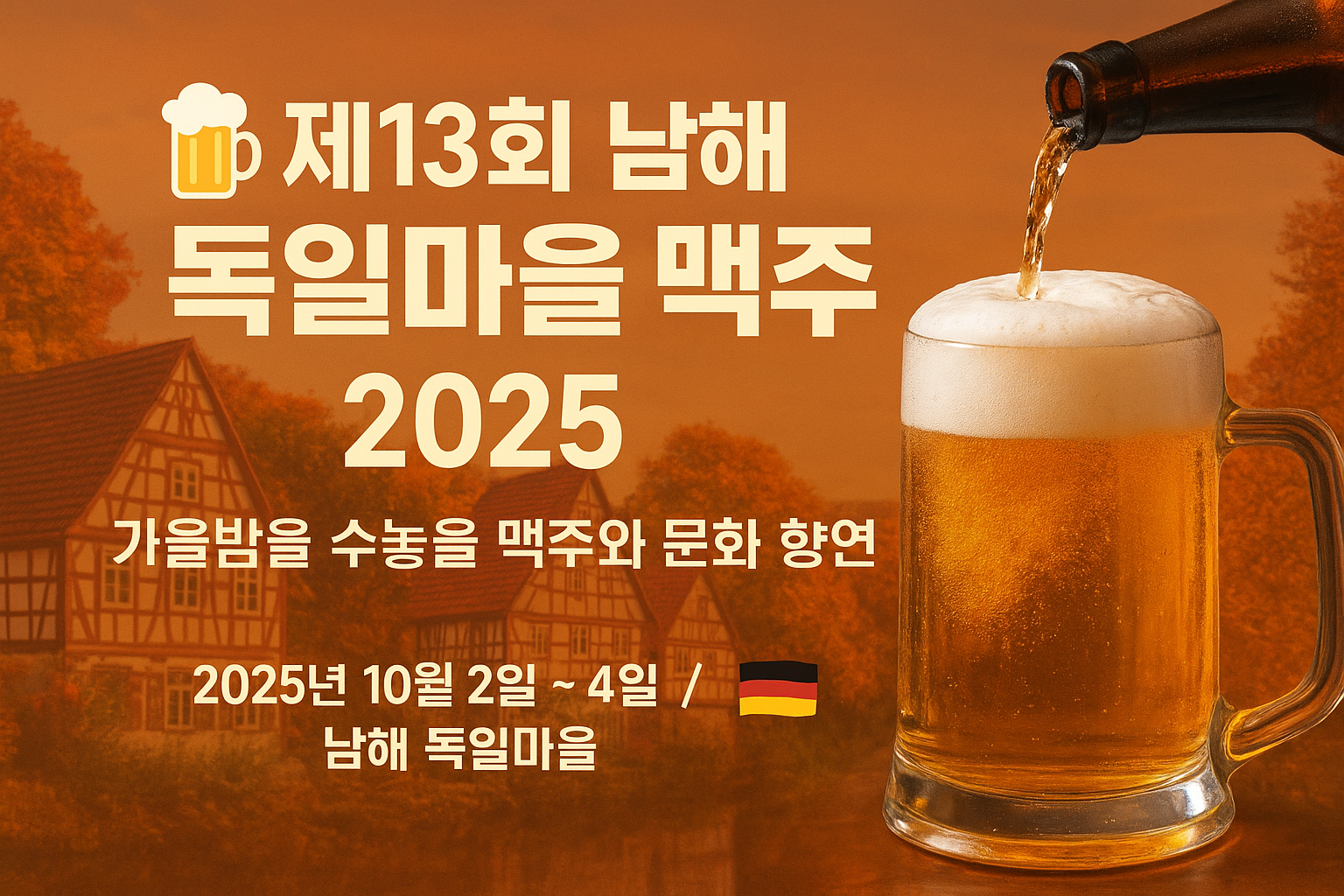 2025년 10월 2일부터 4일까지, 경상남도 남해군 삼동면 독일마을 일원에서 제13회 남해 독일마을 맥주축제가 개최됩니다.